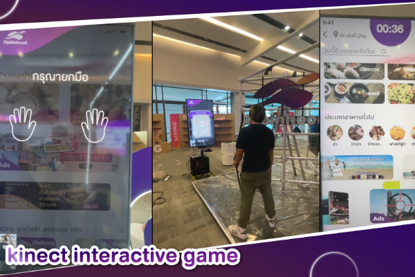 งาน Interactive Game Robinhood ทางลูกค้าต้องการ ใช้แอปพลิเคชั่น Robinhood จัดทำสื่อออกมาประเภท Game โดยใช้ Kinect จับท่าทางของผู้เล่น ให้ยิงตามเป้า